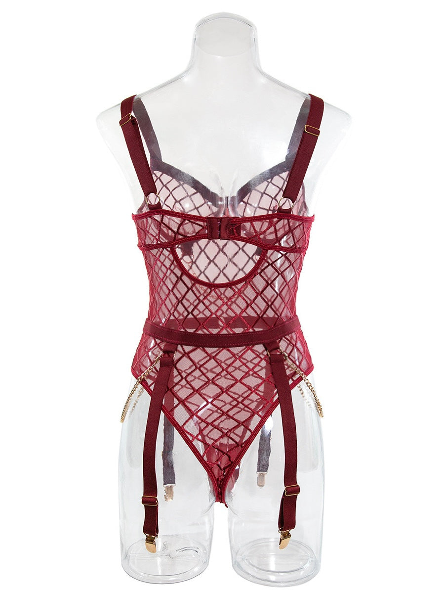 Turn up the heat with the Brianna Bodysuit—a daring blend of mesh and luxe gold chains that commands attention. The bold grid pattern contours your silhouette, while adjustable garter straps let you style it your way. Perfect for a seductive night in or adding edge to any outfit.